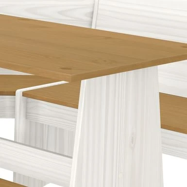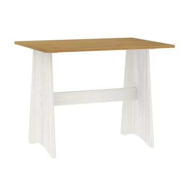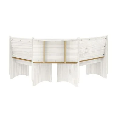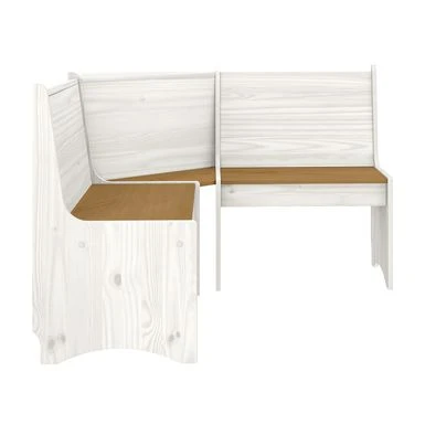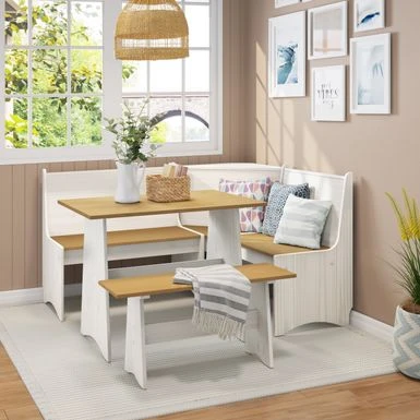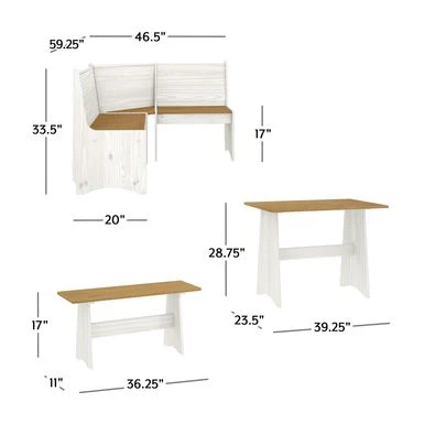 Perfect for lazy Sunday morning coffee and cinnamon rolls, a home cooked dinner, or take out pizza, this corner nook is the perfect update to your kitchen or dining area. Perfect for lazy Sunday morning coffee and cinnamon rolls, a home cooked dinner, or take out pizza, this corner nook is the perfect update to your kitchen or dining area. This cozy and efficient corner unit boasts a space conscious design, a modern farmhouse flair and includes the table, L shaped bench and backless bench. Composed of solid pine for lasting strength and durability, this nook is available in a white and honey option as well as a warm oatmeal finish. Assembly is required. Ships in one box.Features a washed white finish with a honey finish topWood constructionIncludes table, corner bench, and backless benchPerfect fit for smaller kitchen and dining areasDust and polish with non-abrasive cleanersResidential use onlyDimensions: Table Dimensions: 28.75H x 39.25W x 23.5DCorner Bench Dimensions: 33.5H x 59W x 46.5DBackless Bench Dimensions: 17H x 36.25W x 11DSeat Height: 17HRecommended Weight Limit: 250lbsItem will ship in one boxAssembly required