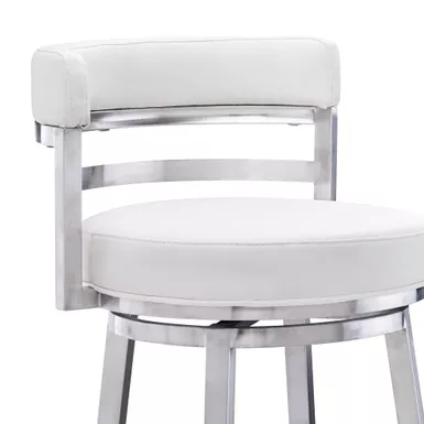 Style and function come together in harmony with the Madrid 26″ Counter Swivel White Faux Leather and Brushed Stainless Steel Bar Stool from Armen Living. Its armless design makes this the perfect addition to any home or apartment as it allows you to pull the kitchen stool as close as needed to your kitchen island, peninsula counter, or home bar. The Madrid frees you of any visual constriction with the 360-degree swivel motion, helping to keep you engaged with your friends at family at gatherings. The upholstered low back is rounded, providing the user with exceptional ergonomic support. The Madrid’s padded bar seat and back are constructed from high-density foam and wrapped in soft faux leather upholstery that will keep you comfortably seated for hours on end. The strong metal frame that’s further accented by the inclusion of a round footrest. The Madrid’s legs are tipped with floor protectors, assuring that the bar stool will not slip on or scratch hardwood or tile floors, ensuring a durable bar stool that will last for many years to come.