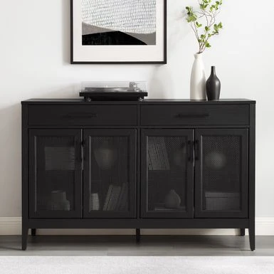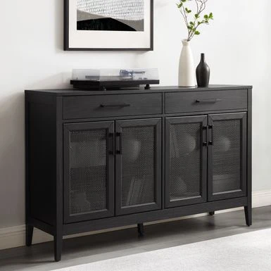 The Milo Sideboard is a versatile furniture piece that complements various home styles. With a simple yet unique design, this sideboard features large cabinet doors with beautiful poly-rattan mesh panels that conceal adjustable and removable shelves. It also has two full-extension drawers on ball-bearing glides, genuine metal hardware in a black finish, and two perforated cable management holes for a tidy setup. This multipurpose sideboard can be used as a traditional sideboard, credenza, or TV stand, and fits most TVs up to 65″. Its sideboard top has a weight limit of 100lbs.