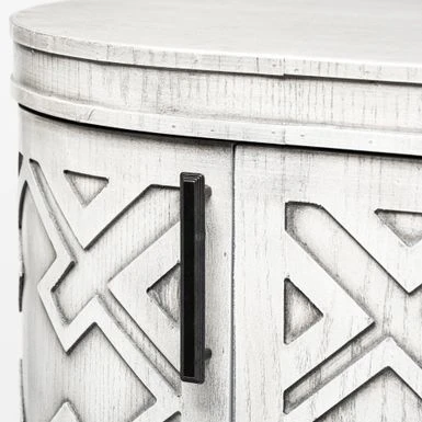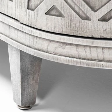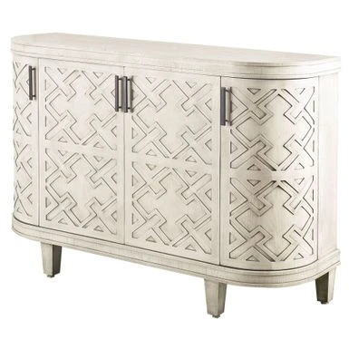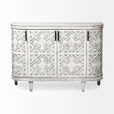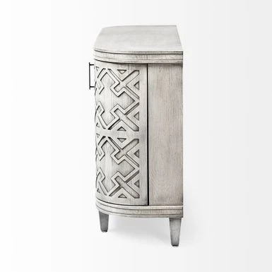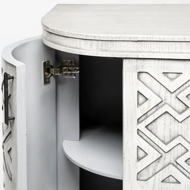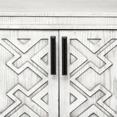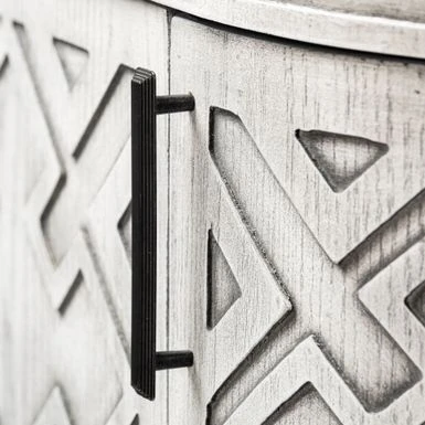 Made from grey finished engineered wood, the Moseley is a beautifully designed four-door cabinet with stunning geometrical patterns on the doors and a curved front. Each door is also equipped with a metal door handle finished in a graphite tone for added convenience. The fixed shelves offer ample storage space for all your favourite items.