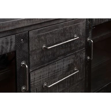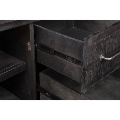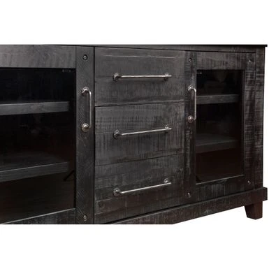 - Features: Three drawers in the middle and two glass door cabinets on both ends with metal handle pull
