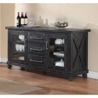 Outfit your dining space with contemporary yet classic appeal with this multi-storage wooden sideboard by Benzara. Outfit your dining space with contemporary yet classic appeal with this multi-storage wooden sideboard by Benzara. The two glass door cabinets offer an elegant view of your favorite teacups and serving dishes, while the three spacious drawers help clear any unsightly clutter and let you organize cutlery, tablecloths, and other belongings with ease. Crafted of solid acacia wood, this sideboard offers a traditional look and coloring that pairs well with your existing furnishings while offering bold and beautiful home design.