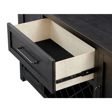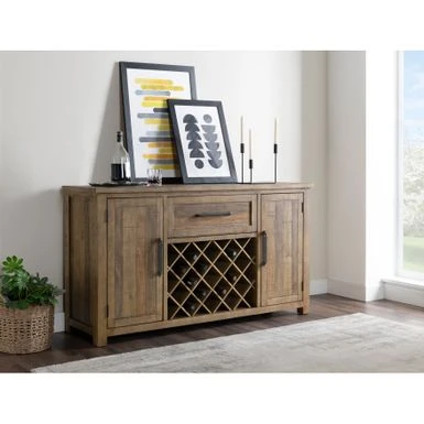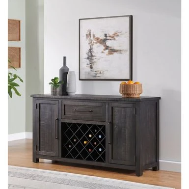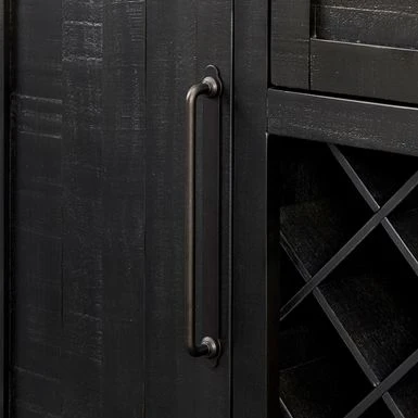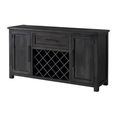 Bring a touch of rustic charm to your dining area with the Napa Solid Wood Server by Martin Svensson Home. This farmhouse-style sideboard buffet offers ample storage with its two cabinets, each featuring adjustable and removable shelves in various configurations. The top drawer and side doors are adorned with a unique oil-rubbed bronze bar pull, inspired by the cask doors found in wineries. The felt-lined drawer provides safekeeping for your silverware and other valuables. The wine storage area can hold up to 16 bottles, making it perfect for entertaining guests. Made from durable solid New Zealand Pine, this server is available in either a reclaimed natural or black finish, both featuring wormwood and distress marked details.