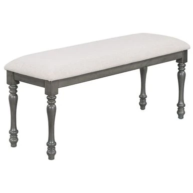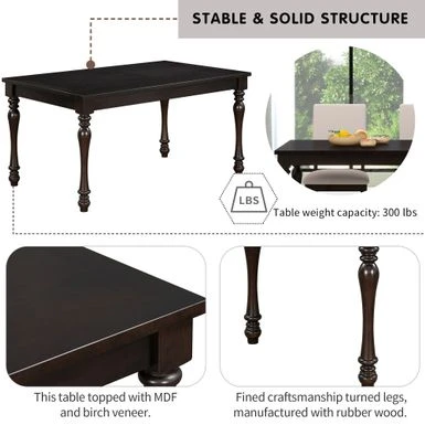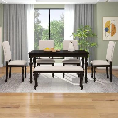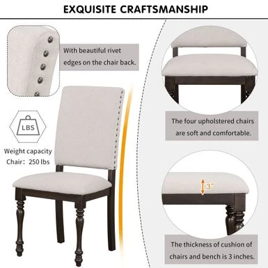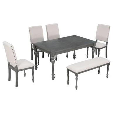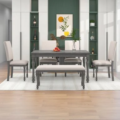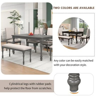 This dining table set includes a rectangular table,4 upholstered chairs and a bench. This set equipped with fined craftsmanship turned legs and boasts a wood finish, which represents a high-end and temperament atmosphere. Whether hosting a dinner party with close friends or enjoying an everyday meal with the family, this 6-piece rubber wood solid wood dining set is a must-have for your home.For stability in daily usage, this table topped with MDF and birch veneer. The table legs and chairs are manufactured with rubber wood. Rubber wood is resistant to drying and does not crack easily. In addition, rubber wood has good wear resistance. Many of the details show the craftsmanship. The four upholstered chairs are soft and comfortable, with beautiful rivet edges on the chair back. The thickness of cushion of chairs and bench is 3 inches to guarantee wonderful using experiences. Four high back upholstered chairs have curved chair back top styling to provide better back support.