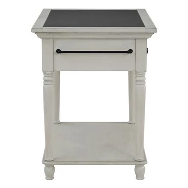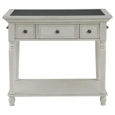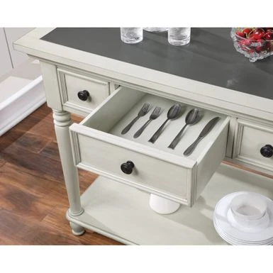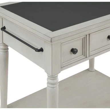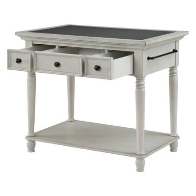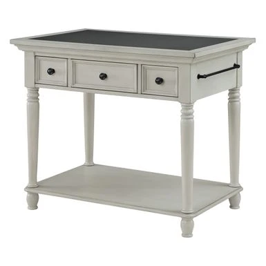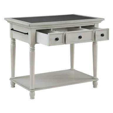 Capturing the classic charm of the modern farmhouse aesthetic, our kitchen Island with composite concrete top, combines beauty and functionality. Its multifunctional design makes it perfect for food preparation, serving, and kitchen storage. Beautiful from every angle, it features a chatter distressed, wood painted finish, contrasted with the clean lines of a durable gray composite food prep surface that mimics the desirable concreate countertop look and feel. Handy single large push-through drawer will hold all your cooking utensils. Lower-level open shelving area is ideal for displaying extra-large pots, large mixing bowls and serving pieces. Black towel bars flank each side of our island and heavy-duty hardware will provide long lasting appeal. Â A must-have addition to any home, this charming kitchen island is sure to be your new favorite place for both cooking and storage.