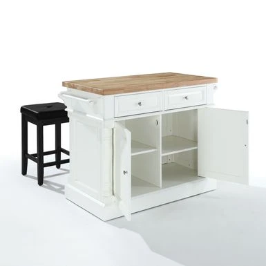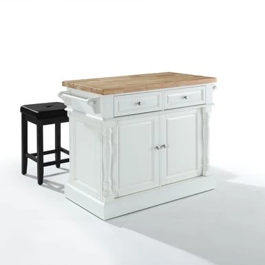 Complete your kitchen space with this stylish and useful kitchen island. Made of solid hardwood, this island includes multiple drawers and cabinets for storing your belongings. Two square stools are included for a complete set.