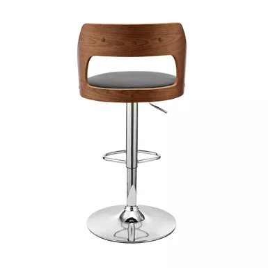 The Paulo Adjustable Swivel Black Faux Leather and Walnut Wood Bar Stool with Chrome Base is the ideal addition to any home or apartment. The wide seat and ergonomic design are capable of keeping you comfortable and relaxed as long as you like. This stool combines mid-century aesthetics with a dash of retro chic glamour. The adjustable seat height functionality allows you to use this stool at your kitchen island, home bar, or peninsula without having to worry about the surface height. The convenient swivel function optimizes everyday use or entertaining, keeping everyone engaged regardless of their place in the room. The plush padded and high-density foam seat and back rest atop a strong pedestal base that creates a sturdy and comfortable seating experience.