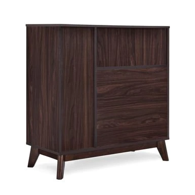 FAUX WOOD: Made with faux wood, this cabinet blends together a beautiful wood look with the strength of real wood. Resistant to moisture, this material provides a smooth and refined finish to any room. This piece is finished with splayed legs for a mid-century look.