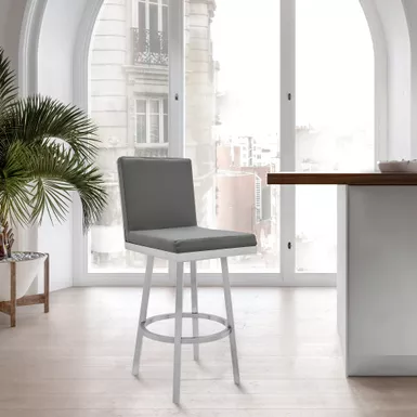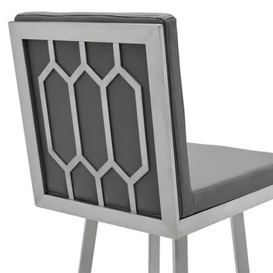 The Rochester Swivel Modern Metal and Faux Leather Stool is the unique furniture addition you need. The intricate geometric metal design on the back makes this a conversation starter at all your gatherings. The cool metal base and seat are complimented by the soft faux leather upholstery that makes cleanup a breeze for any spills or messes. The Rochester bar stools include a full range swivel functionality that allows you optimal mobility and comfort for hours on end. These stools are a perfect addition to your kitchen island, counter, peninsula, bar, or pub table. Prop your feet up on the convenient square metal footrest and enjoy ultimate comfort after a long day.