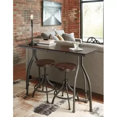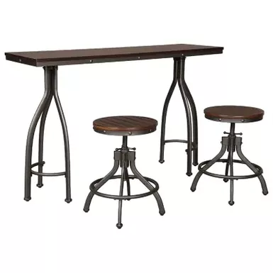 Take casual dining to new heights with the Odium counter height rectangular table and bar stools set. The table is scaled down to fit in the smallest of spaces─perfect anywhere, especially in a studio apartment or narrow kitchen nook. Admire how the dark bronze-tone powder coat metal finish, planked looking table top and swivel stools reflect the popular rustic, industrial style. Decorative details include metal rivets and curved metal design. The stools conveniently swivel and their heights are adjustable, perfect for flexibility.