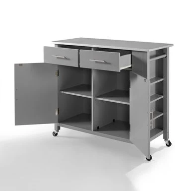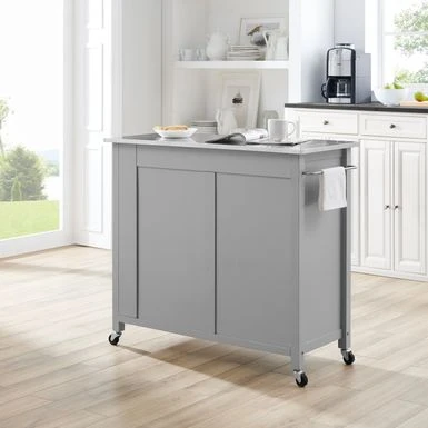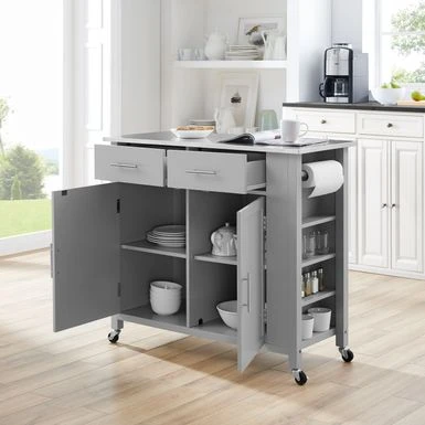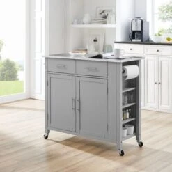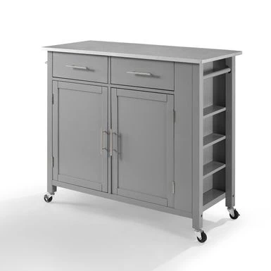 Designed for home organization and meal prep, the Savannah Kitchen Island/Cart delivers both style and functionality in a sleek mobile package. Designed for home organization and meal prep, the Savannah Kitchen Island/Cart delivers both style and functionality in a sleek mobile package. Featuring two large cabinets with adjustable shelves, you can store pots, pans, and small appliances with ease. Throw in a spice rack and two full-extension storage drawers, and you have all the storage of a built-in kitchen island, but with the bonus of caster wheels for movement. The Savannah Kitchen Island offers a solid natural wood countertop, a towel bar, and paper towel holder, making it an ideal workspace for preparing your next meal. – Transitional design- Stainless steel countertop – Gray finish – Genuine metal hardware in a brushed nickel finish – Two spacious storage cabinets – Two full-extension storage drawers – Includes towel bar in a brushed nickel finish – Built-in spice rack – Built-in paper towel holder – Includes four caster wheels with two that lock – Caster wheels can be removed for use as a stationary island – Island height without casters is 34.5″ – Pairs well with modern, traditional, and farmhouse decor