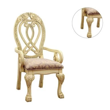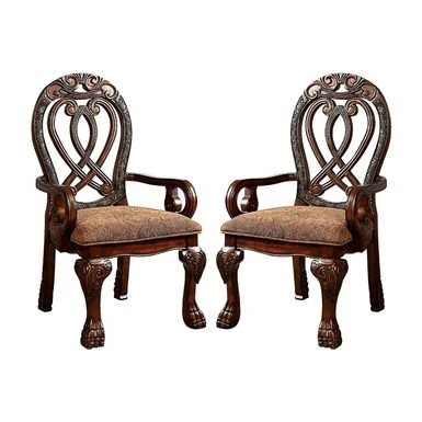 Stately profiles and dramatic curves are further emphasized by a lustrous finish. The arm chair with Intricate carvings back,dramatic legs and comfortable fabric cushion can elevate your dining style.Sold in a convenient set of two. Stately profiles and dramatic curves are further emphasized by a lustrous finish. The arm chair with Intricate carvings back,dramatic legs and comfortable fabric cushion can elevate your dining style.Sold in a convenient set of two.