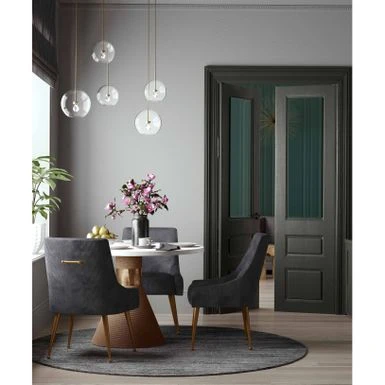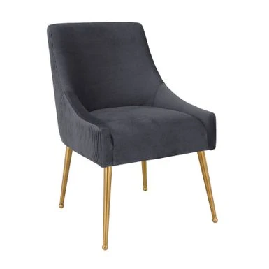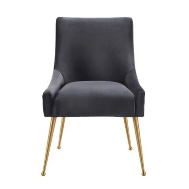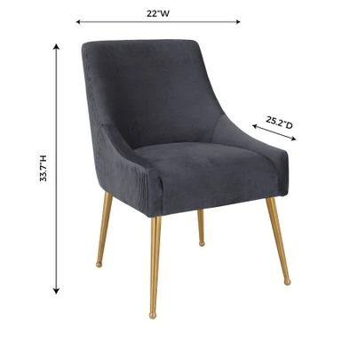 Add some extra seating to your home with this pleated grey velvet side chair. This chair is elegantly handmade with a curved design and fab gold stainless steel legs. The solid kiln dried wood frame with webbing support makes this a long-lasting addition to your home. Perfect at the dining table or in your living room, this versatile side chair’s pretty grey color lends feminine charm to any space.