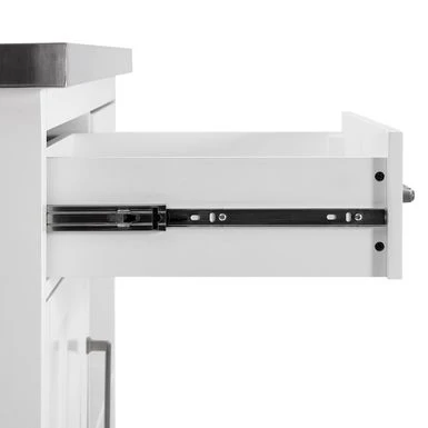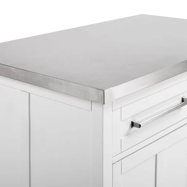 Add storage, workspace, and a dining area to your kitchen with the Silvia Kitchen Island. Classic recessed panels and oversized bar hardware make this island perfect for a variety of home styles. Add storage, workspace, and a dining area to your kitchen with the Silvia Kitchen Island. Classic recessed panels and oversized bar hardware make this island perfect for a variety of home styles. With full-extension drawers, a large cabinet, and open shelving, all your kitchen items will stay neat and tidy. The oversized countertop extends past the island base creating dining space for a casual evening meal.Features:Traditional designBuilt-up stainless steel countertopWhite finishGenuine metal bar hardware with a brushed nickel finishShaker-style recessed panels on cabinet door and drawer frontsCabinet door has a magnetic closureTwo adjustable and removable shelves, each with a 15lb weight limitTwo full-extension drawers on ball-bearing glides, each with a 15lb weight limitLarge countertop extends 10″ past the base adding space for seatingTapered legsCountertop weight limit is 100lbsPairs well with modern and farmhouse decor