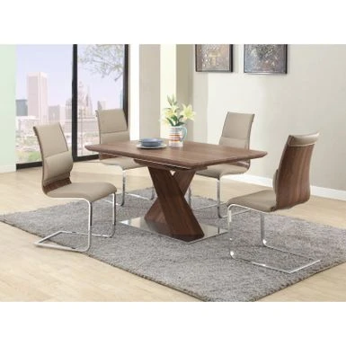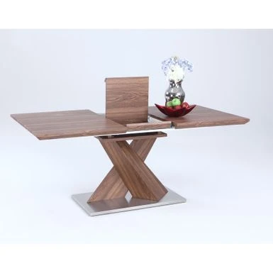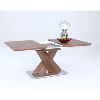 This modern extendable dining table features a laminated wooden top and X-Shaped pedestal with a brushed stainless steel floor plate. The built-in butterfly extension effortlessly opens the table from 36x 56″ to 36x 72″ long. The top is heat & scratch resistant to keep the table low maintenance for your convenience. The extension is easy to operate, making a greater table size available to quickly accommodate additional guests.