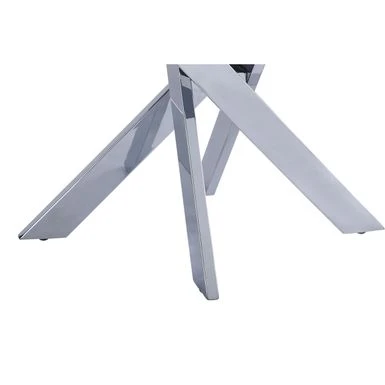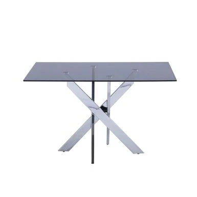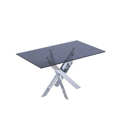 This rectangular dining table features a sleek and modern tinted glass top and shiny metal base that will add flare and high end look to any space.