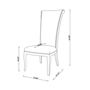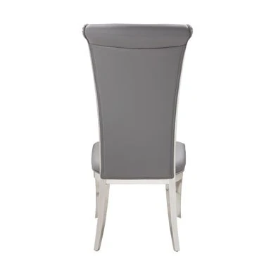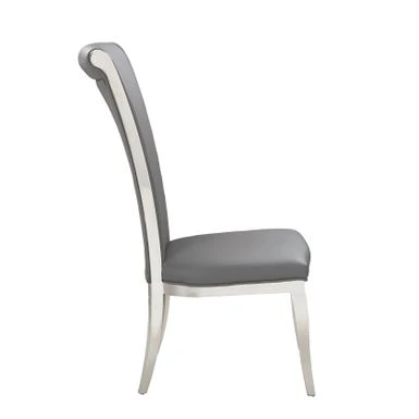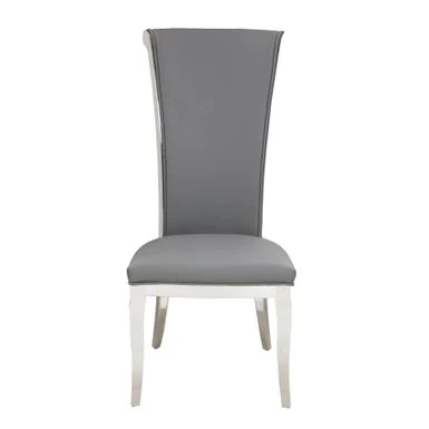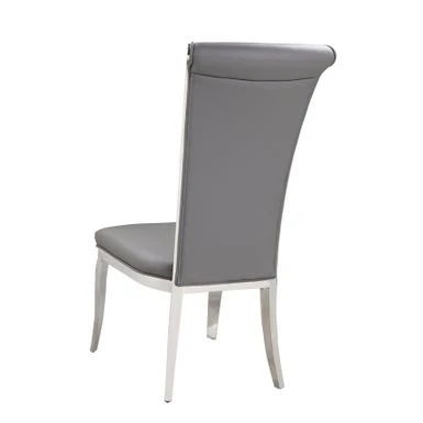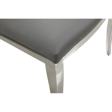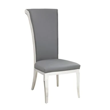 This contemporary, high-back side chair features a thick seat cushion upholstered in faux leather, with decorative piping on a polished stainless steel frame.