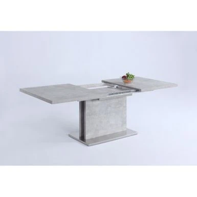 This dining table features an easy-to-use butterfly-extension mechanism, with a gray laminated wooden top & pedestal set on a brushed stainless steel floor plate, presenting a solid, neutral look that elegantly compliments your contemporary dining room.