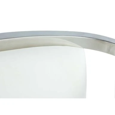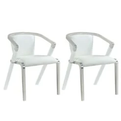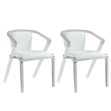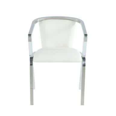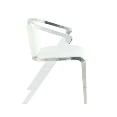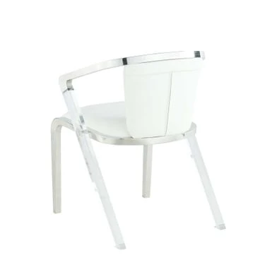 This modern chair features a mixed-media design with white faux leather upholstered seat & back and a decorative stitch down the rear center, set on a polished stainless steel and solid acrylic frame.