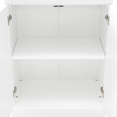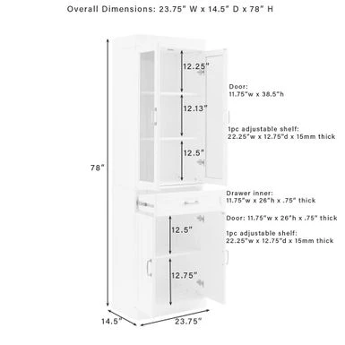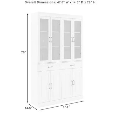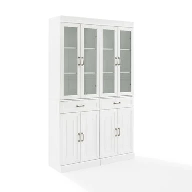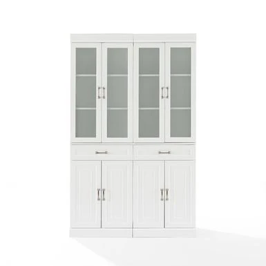 Create the look of a classic built-in china cabinet and buffet with the Stanton 2pc Glass Door Pantry Set. Create the look of a classic built-in china cabinet and buffet with the Stanton 2pc Glass Door Pantry Set. Each tall pantry features upper cabinets with tempered glass doors for displaying your best dishware or keepsakes, plus adjustable shelving for flexibility. The lower cabinets of each pantry also offer adjustable shelving that is concealed by panel doors. Both pantries have a full-extension storage drawer for smaller items. Keep any room in your home organized with the Stanton 2pc Glass Door Pantry Set.Features:Traditional designWhite finishGenuine metal hardware in a brushed nickel finishEach pantry has two large cabinets with double doors, magnetic closures, and concealed hingesBoth upper cabinets have two adjustable and removable shelves each with a 15lb weight limitBoth lower cabinets have an adjustable and removable shelf each with a 15lb weight limitEach pantry has a full-extension storage drawer on ball-bearing glides with a 15lb weight limitRecessed paneling on cabinet doors and drawer frontsAll pieces are modular to maximize space and flexibilityPairs well with modern farmhouse decorUpper cabinets have tempered glass doors