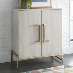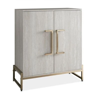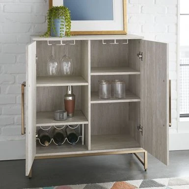 Upgrade your home bar or living room with the sleek and modern Lanett mixed media wine cabinet from Strick & Bolton. Featuring a stunning white faux marble finish and a matte gold chrome sled-style base, this wine cabinet adds a touch of Eastern influence to any space. The cabinet doors with C-shaped pulls open to reveal four adjustable shelves, two hanging stemware racks, and a bottle holder, providing ample storage space for your wine collection and accessories.