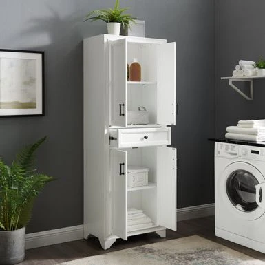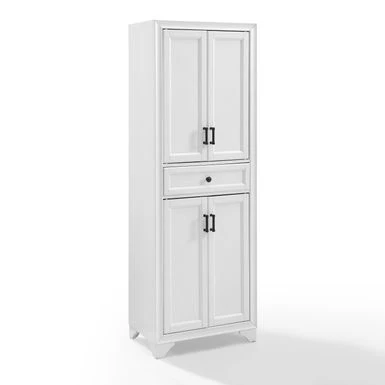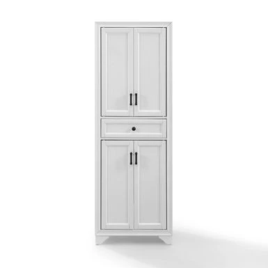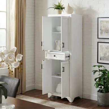 Bring classic charm to kitchen organization with the Tara Pantry. Featuring a beautifully distressed finish and traditional design elements, this pantry will store everything from towels to dishes to cookware. Bring classic charm to kitchen organization with the Tara Pantry. Featuring a beautifully distressed finish and traditional design elements, this pantry will store everything from towels to dishes to cookware. Both the upper and lower cabinets include an adjustable shelf that adapts to your needs plus double cabinet doors with elegant metal hardware. At the center of the pantry is a large full-extension storage drawer on ball-bearing glides, ideal for flatware and other kitchen odds and ends that need a home. The Tara Pantry is the home organization tool you’ve been looking for. – Transitional design – Distressed white finish – Two large cabinets with double doors – One adjustable shelf in each cabinet – One large storage drawer on full-extension ball-bearing glides – Genuine metal hardware in a distressed brass finish – Pairs well with traditional, cottage and modern farmhouse dcor