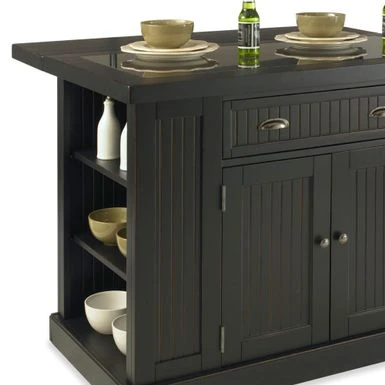 Add a touch of sophistication to your kitchen with The Gray Barn Firebranch 3-pc. Distressed Black Kitchen Island Set. With its elegant granite inlay, sanded distressed black finish, and antique brushed nickel hardware, this set is sure to impress. The island features adjustable shelves on each side, a storage drawer, and a cabinet, while the two armless stools offer ample comfort with their foam-cushioned seats and backs. The 10-inch dropleaf extends the top surface to 37 inches deep, making it perfect for food preparation or entertaining guests.