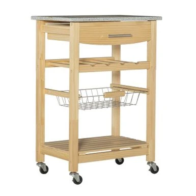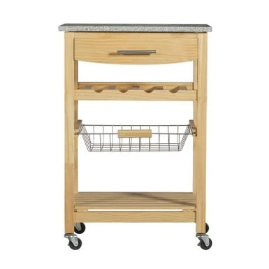 Expand work and serving space with this farmhouse-style granite top kitchen cart. It’s perfect for meal preparation, storage, serving, or housing small kitchen appliances. The food-safe, easy-to-maintain granite top is suitable for your coffee maker or compact microwave. It creates an elegant yet natural feel with several spacious storage options, including a top drawer, four bottle rack, slatted bottom shelf, and a pull-out wire basket that helps keep produce fresh. The cart’s heavy-duty, locking casters provide easy mobility and safety within your home.Â