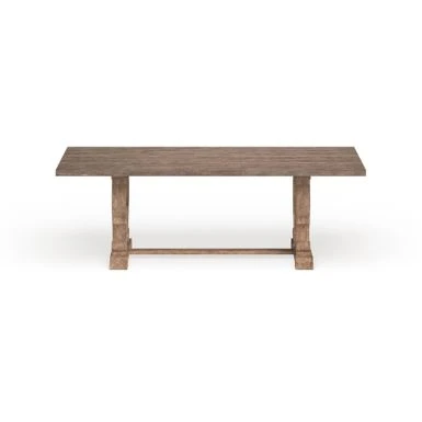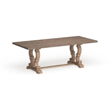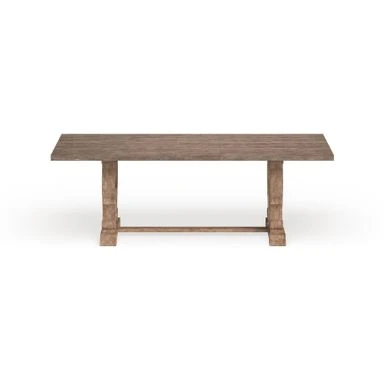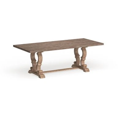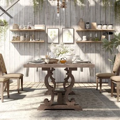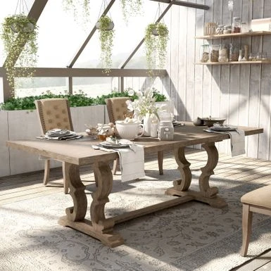 Add a fresh look to your dining area with this 90-inch expandable dining table. The distressed wood frame has a natural wood grain feel and weathered finish. The curved carved trestle base has an old world feel and imparts class to this elegant dining table design. The table has a trestle base and carved detailing.