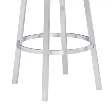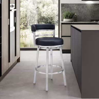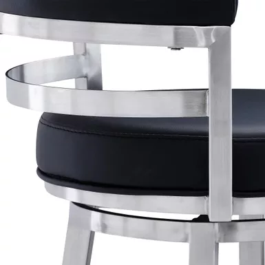 Style and function come together in harmony with the Titana 26″ Counter Swivel Black Faux Leather and Brushed Stainless Steel Bar Stool from Armen Living. Its armless design makes this the perfect addition to any home or apartment as it allows you to pull the kitchen stool as close as needed to your kitchen island, peninsula counter, or home bar. The Titana frees you of any visual constriction with the 360-degree swivel motion, helping to keep you engaged with your friends at family at gatherings. The upholstered low back is rounded, providing the user with exceptional ergonomic support. The Titana’s padded bar seat and back are constructed from high-density foam and wrapped in soft faux leather upholstery that will keep you comfortably seated for hours on end. The strong metal frame that’s further accented by the inclusion of a round footrest. The Titana’s legs are tipped with floor protectors, assuring that the bar stool will not slip on or scratch hardwood or tile floors, ensuring a durable bar stool that will last for many years to come.