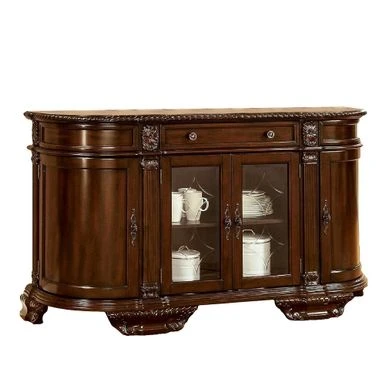 With a brown cherry finish along with clean straight lines, this style server contributes to a very classic look. Solid wood contemporary storage server features three cabinets, drawers, and shelves that are perfect for storing different items. Elevate your living space, lounge, or even dining room atmosphere with this server.