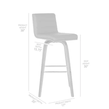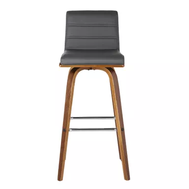 The Vienna 30″ Swivel Grey Faux Leather and Walnut Wood Bar Stool by Armen Living provides both versatile style and comfort with a Mid-Century Modern design that can easily be integrated into your home’s current décor. The 360-degree swivel function provides optimal mobility so you and your guests to stay engaged regardless of your place in the room at parties and gatherings. The Vienna’s frame is constructed of strong wood that is brilliantly accented by the plush high-density foam cushion that’s wrapped in faux leather upholstery. A square metal footrest is added for a chic and stylish aesthetic without comprising practicality and functionality of this item. The soft faux leather upholstery makes clean up a breeze, making this the perfect bar stool for any entertaining home! With multiple bar seat height options and the armless design, you can easily pull the Vienna up to your kitchen island, peninsula counter, or home bar. The high seat back ergonomic properties to keep your back healthy and properly aligned. The Vienna is an ideal addition to any home or apartment and its quality materials ensure a comfortable seat for many years to come.