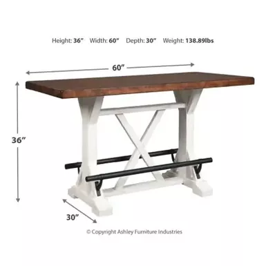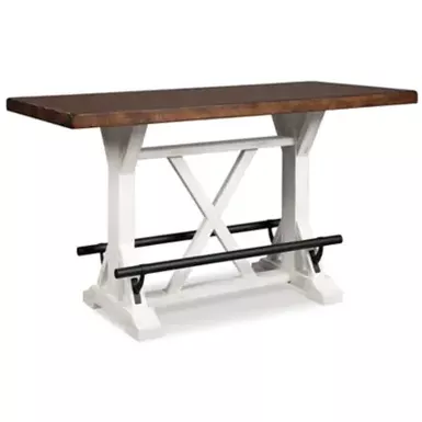 A high-style choice for smaller spaces, the Valebeck counter-height dining table serves up the best in rustic farmhouse living. Two-tone finish pairs a brown tabletop with a distressed vintage white base for a double helping of charm. Black metal foot rests add such a distinctive twist.
